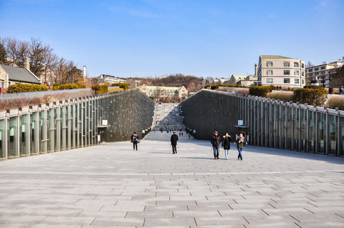 校园的中轴线上,有一座现代风格的新建筑,但并非高楼,而是往地下挖掘的半埋式结构,设计师巧妙地利用了首尔起伏的地势,将新的建筑融入了校园环境,而完全没有破坏原有的景观。