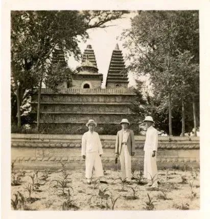 1935年,杨廷宝(中)与刘敦桢(右)等勘察真觉寺金刚宝座塔